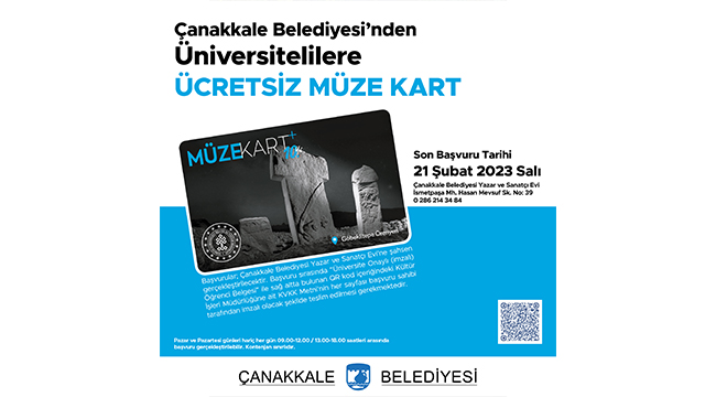Son başvuru tarihi 21 Şubat 2023 Salı günü olan müze kartlar için başvurular; Çanakkale Belediyesi Yazar ve Sanatçı Evi’ne şahsen gerçekleştirilecek. Başvuru sırasında “Üniversite Onaylı (imzalı) Öğrenci Belgesi” ile aşağıda bulunan Kişisel Verilerin Korunması Kanunu’na ait metnin her sayfası başvuru sahibi tarafından imzalı olacak şekilde teslim alınacaktır. Metne, görsel üzerindeki QR kod içeriğinden de ulaşılabilir.
