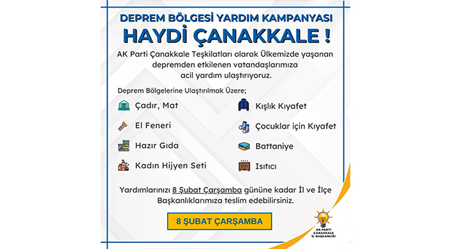 Hemşehrilerimiz deprem bölgelerine ulaştırılmak üzere çadır, mat, el feneri, hazır gıda, kadın hijyen seti, kışlık kıyafet, çocuklar için kıyafet, battaniye ve ısıtıcı gibi yardımlarını, 8 Şubat Çarşamba gününe kadar İl ve İlçe Başkanlıklarımıza teslim edebilir. Milletvekilimiz Jülide İskenderoğlu’yla birlikte hayatını kaybeden vatandaşlarımıza Allah’tan rahmet, yaralılarımıza acil şifalar diliyor; aziz milletimize bir kez daha geçmiş olsun dileklerimizi iletiyoruz.” şeklinde konuştu.