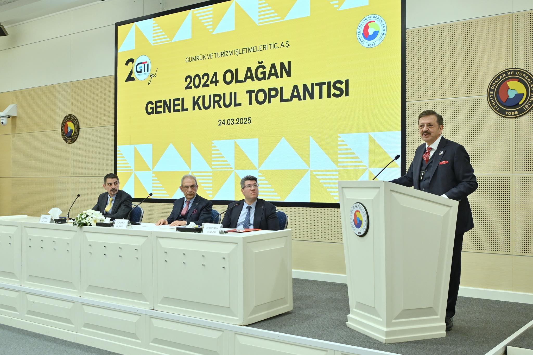 Çanakkale Ticaret Borsası Yönetim Kurulu Başkanı Abdullah Deniz, Çanakkale Ticaret Borsasını temsilen Gümrük ve Turizm İşletmeleri (GTİ) Genel Kuruluna katıldı.TOBB Başkanı M.Rifat Hisarcıklıoğlu’nun teşrifleriyle, açılış konuşmaları ile başlayan GTİ Genel Kurulu’nda, saygı duruşu ve istiklal marşının okunmasından ardından, Genel Kurulda, 2024 yılı faaliyet raporu, finansal tabloları sunuldu.GTİ Olağan Genel Kurulu ile ilgili değerlendirmede bulunan Çanakkale Ticaret Borsası Başkanı Abdullah Deniz; “Türkiye Odalar ve Borsalar Birliği öncülüğünde, ilgili kanun hükümleri çerçevesinde, 2005 yılında kurulan şirketimiz, 137 oda ve borsanın da katılımıyla, ülke ekonomimiz açısından stratejik bir şirket haline gelmiştir. Yap-İşlet-Devret” modeli ile kara sınır kapılarının modernizasyonunun Türkiye’de ve Dünyada ilk ve tek uygulayıcısıdır. Modernize edilen gümrük tesislerinde, bürokrasinin azaltılması amacına yönelik düzenlemeler hedeflenmiş, geçen yolcunun aracını terk etmeden, tek bir hat üzerinde bütün işlemlerini tamamlayabilmesi esas alınmış, bu doğrultuda araçların tüm işlemlerinin peronlarda yapılmasına olanak sağlayacak bir mimari yapı tasarlanmıştır. ” dedi.Gümrük tesislerinin modernizasyonu ile sınır geçiş sürelerinin azaltılması, bu sayede dış ticaretin kolaylaştırılması ve tesis edilen yüksek teknoloji ekipmanlarla kaçakçılıkla etkin bir mücadele sağlanmasının hedeflendiğini belirten Çanakkale Ticaret Borsası Başkanı Deniz, “Bu hedefler doğrultusunda çalışmalarını yürüten Başta TOBB Başkanımız M. Rifat Hisarcıklıoğlu olmak üzere, GTİ Yönetim Kurulu Başkanımız Sn. M. Arif Parmaksız’ı ve değerli yönetim kurulunu başarılı çalışmalarından dolayı tebrik ediyorum” dedi