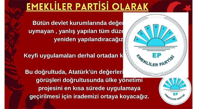 Emekliler Partisi sosyal medya hesabından yapılan paylaşımda, “Bütün devlet kurumlarında değerlerimize uymayan, yanlış yapılan tüm düzenlemeleri yeniden yapılandıracağız. Keyfi uygulamaları derhal ortadan kaldıracağız. Bu doğrultuda, Atatürk’ün değerleri, ilkeleri ve görüşleri doğrultusunda ülke yönetimi projesini en kısa sürede uygulamaya geçirilmesi için irademizi ortaya koyacağız” ifadeleri yer aldı.