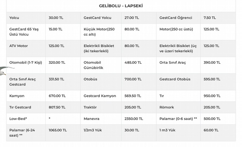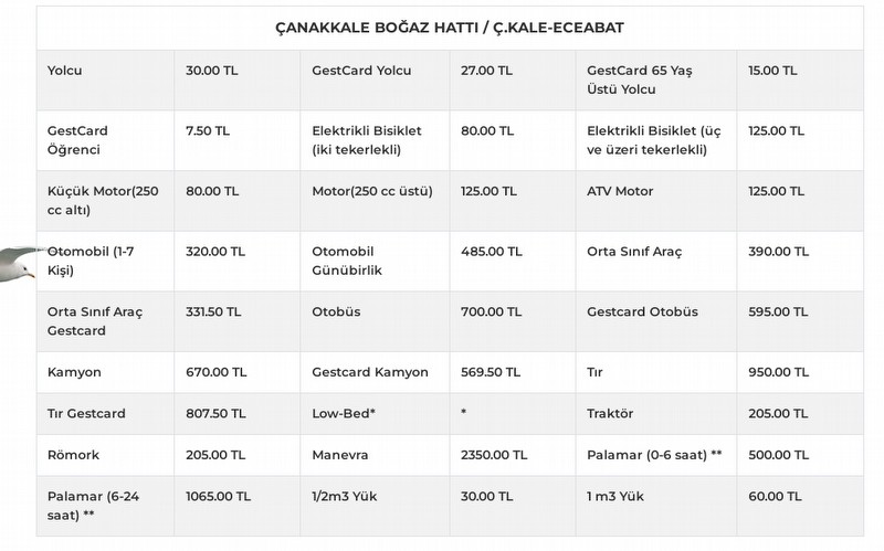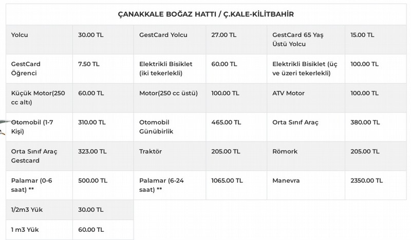 Çanakkale Boğazı, Gökçeada ve Bozcaada'nın yanı sıra Güney Marmara'da deniz ulaşımını sağlayan Gestaş, fiyat tarifelerini bugünden itibaren geçerli olmak üzere güncelledi. Geçtiğimiz hafta köprü ve otoyollardaki geçişlere gelen zamların ardından bu kez denizde de fiyat tarifesi değişti. Çanakkale'de deniz ulaşımını sağlayan Gestaş, boğaz hattı ile Gökçeada ve Bozcaada'ya geçişlerde bilet fiyatlarında ücret artışına gitti. Yeni Feribot geçiş ücretleri firmanın internet sitesinde yer aldı. Güncellenen tarifeye göre Çanakkale-Eceabat arası yolcu ücreti 20 liradan 30 liraya, otomobil 250 liradan 320 liraya çıktı. Bu hattaki günübirlik otomobil geçiş ücreti ise 375 iken 485 lira oldu. Çanakkale-Kilitbahir hattında yeni yolcu ücreti 30 lira, otomobil 310 lira olarak belirlendi. Günübirlik otomobil geçişleri ise 465 lira şeklinde belirledi. Gelibolu-Lapseki hattında yeni fiyatlar, Çanakkale-Eceabat hattıyla hemen hemen aynı oldu.Kaynak:Gazeteboğaz