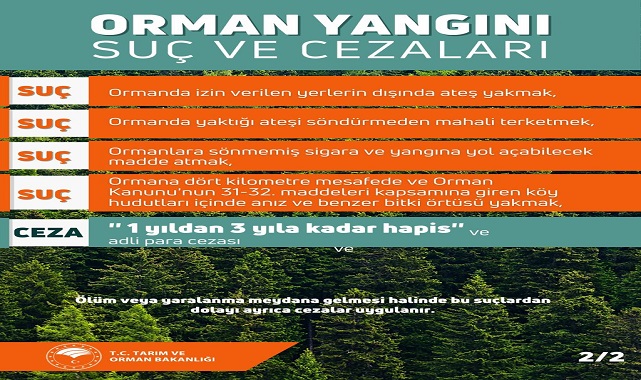 Paylaşılan görselde ise Orman Yangını Suç ve Cezaları aktarıldı. Buna göre, kasten orman yakmanın 10 yıldan az olmamak üzere hapis ve bin günden on bin güne kadar adli pazara cezası, devletin güvenliğine karşı kurulmuş terör örgütü faaliyeti çerçevesinde ormanları yakmanın cezası ise müebbet hapis, yirmi bin günden yirmi beş bin güne kadar adli para cezasına çarptırılır. Dikkat ve özen yükümlülüğüne aykırı olarak orman yangınına sebebiyet ise 3 yıldan 10 yıla kadar hapis cezası ile yargılanır.