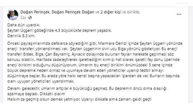Prof. Dr. Doğan Perinçek, sosyal medya hesabından dikkat çeken bir değerlendirmede bulundu. Prof. Dr. Perinçek, “Devamı gelecektir, umarım artçılar 4 büyüklüğü geçmez” ifadeleri yer aldı.
