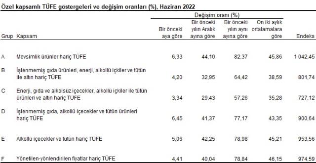 İşlenmemiş gıda ürünleri, enerji, alkollü içkiler ve tütün ile altın hariç TÜFE'de 2022 yılı Haziran ayında bir önceki aya göre %4,20, bir önceki yılın Aralık ayına göre %32,95, bir önceki yılın aynı ayına göre %64,42 ve on iki aylık ortalamalara göre %38,59 artış gerçekleşti.