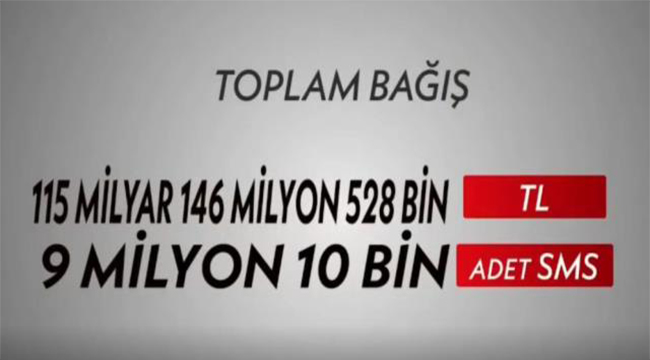 Yaklaşık 8 saat süren programda toplanan bağış miktarı 115 milyar TL'yi aştı. Ortak yayın boyunca 115 milyar 146 milyon 528 bin TL bağış toplandı ve 9 milyon 10 bin adet SMS gönderildi.